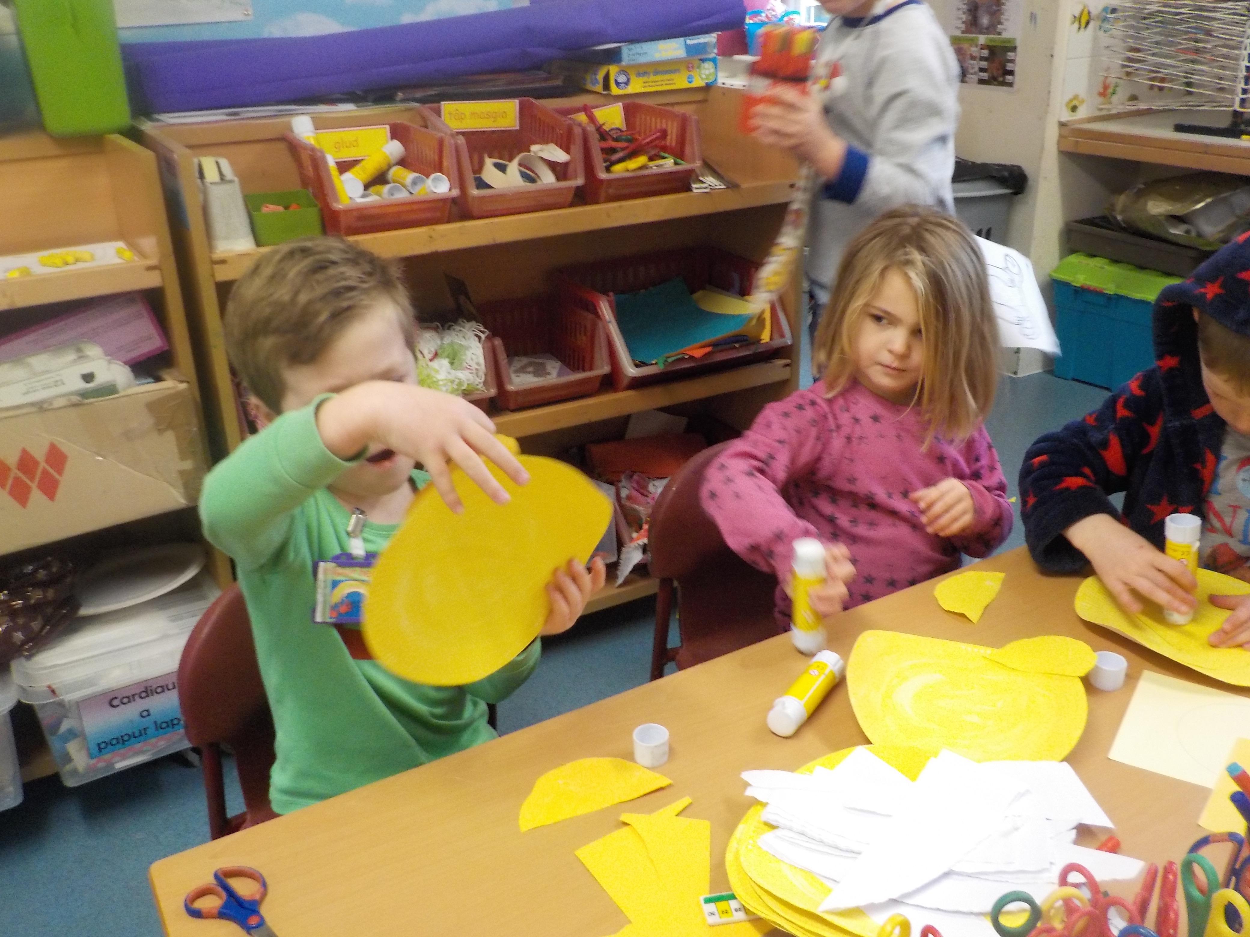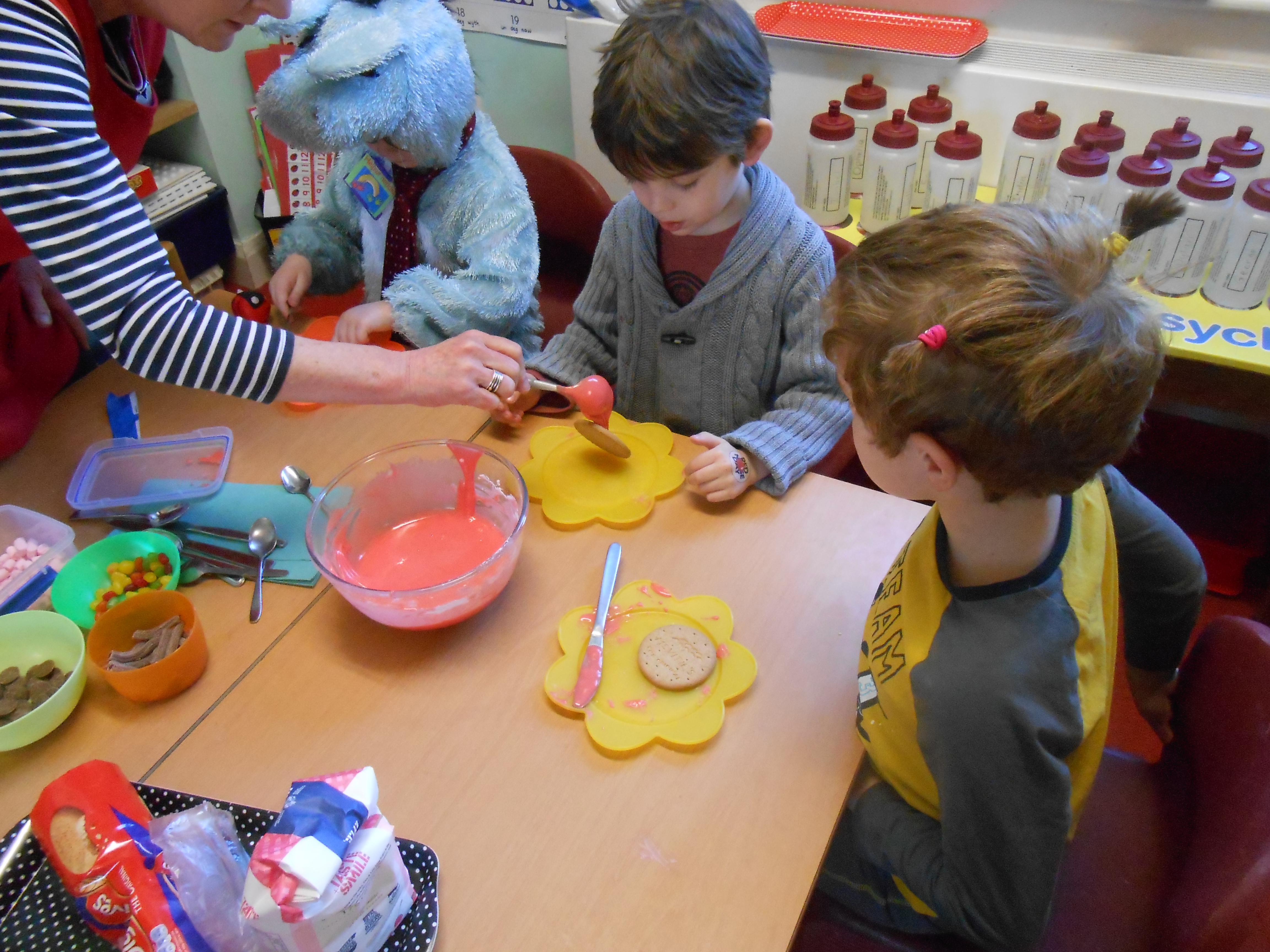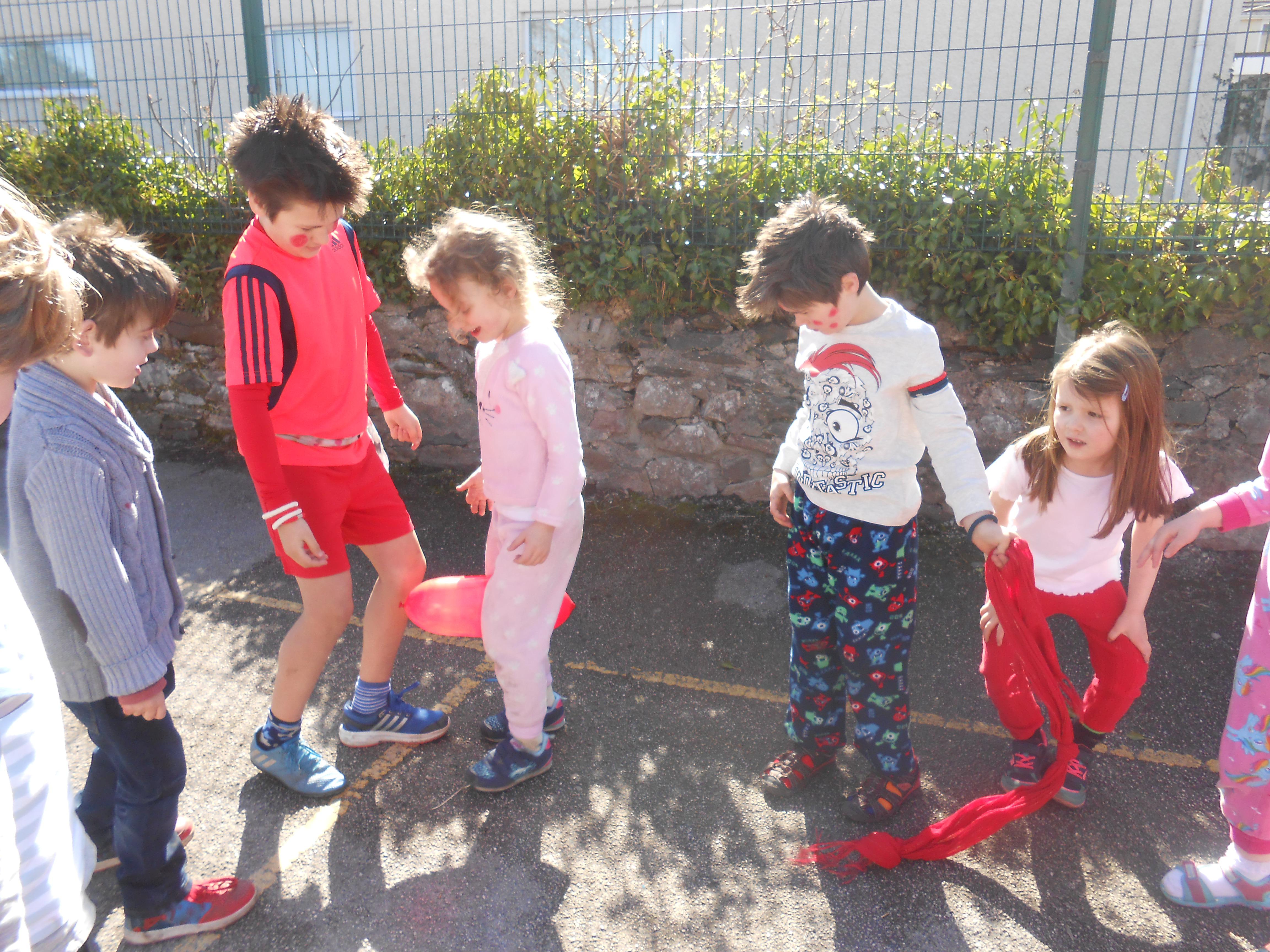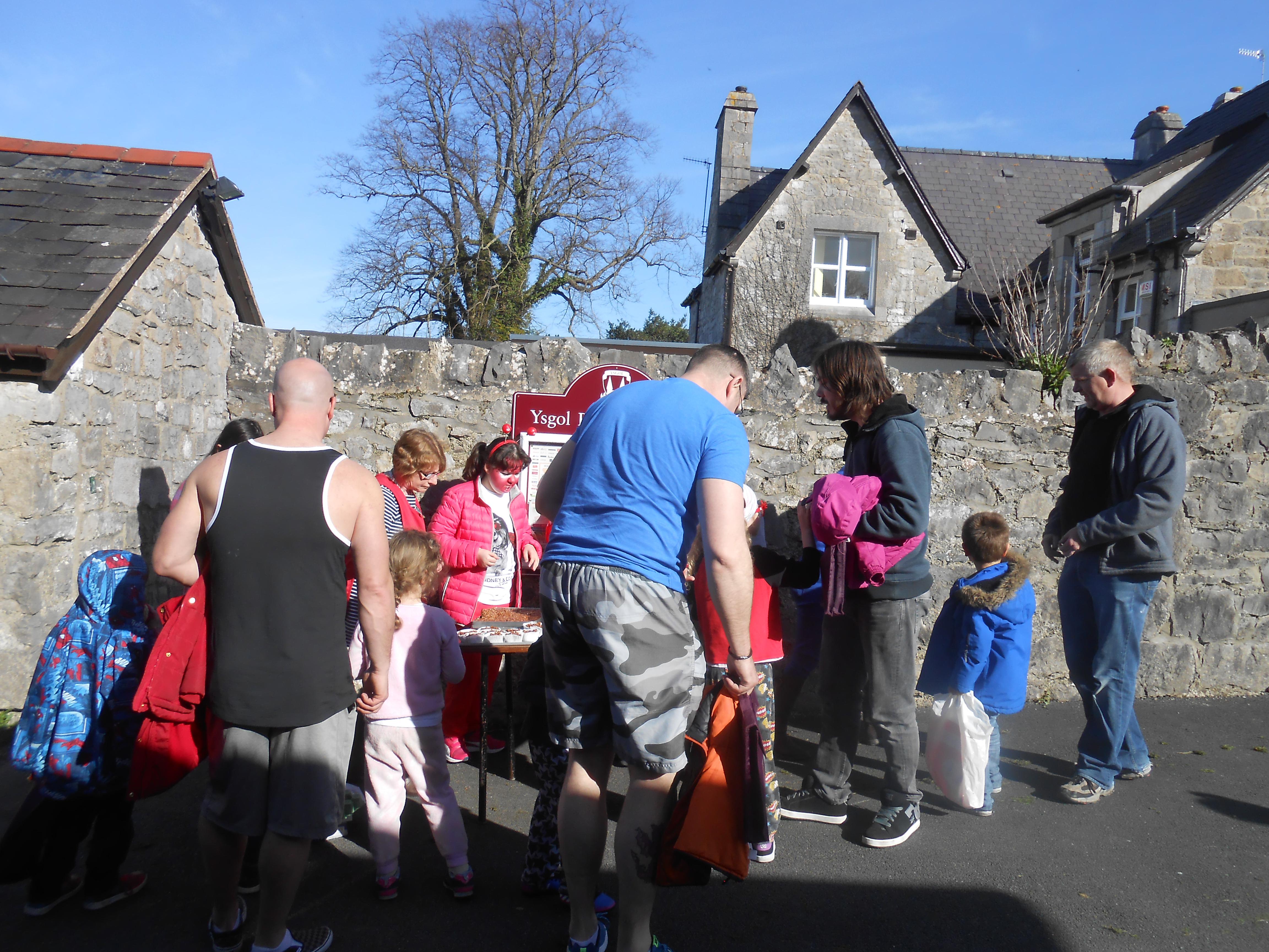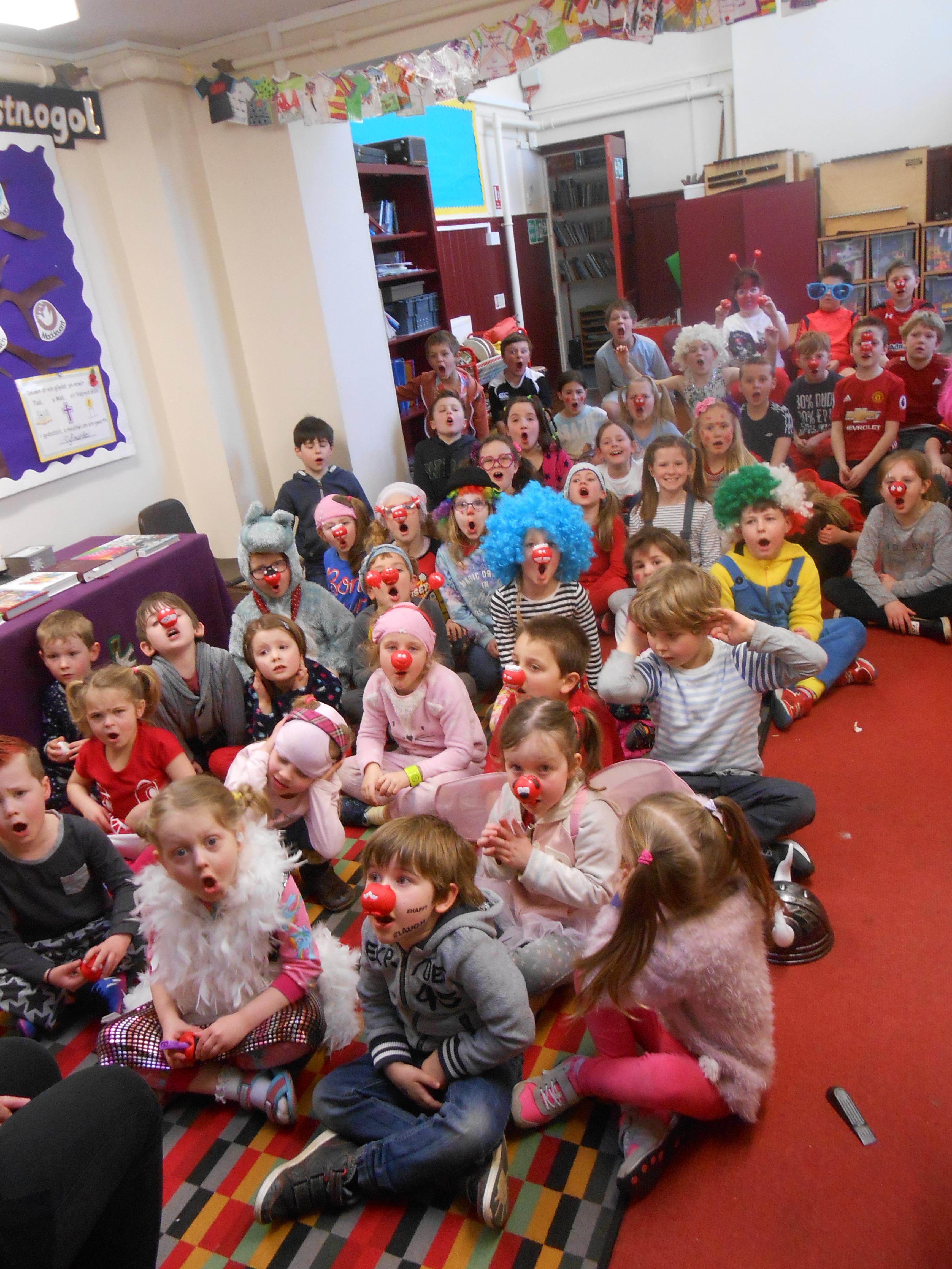 Roedd pawb wedi gwisgo mewn dillad doniol, a cawsom ddiwrnod prysur yn addurno bisgedi trwyn coch, gwerthu trwynau coch, cael helfa trwynau coch, gemau balwns coch, dylunio trwyn coch a stondin gacennau hefyd. Diolch i bawb am godi £109 at achos da.