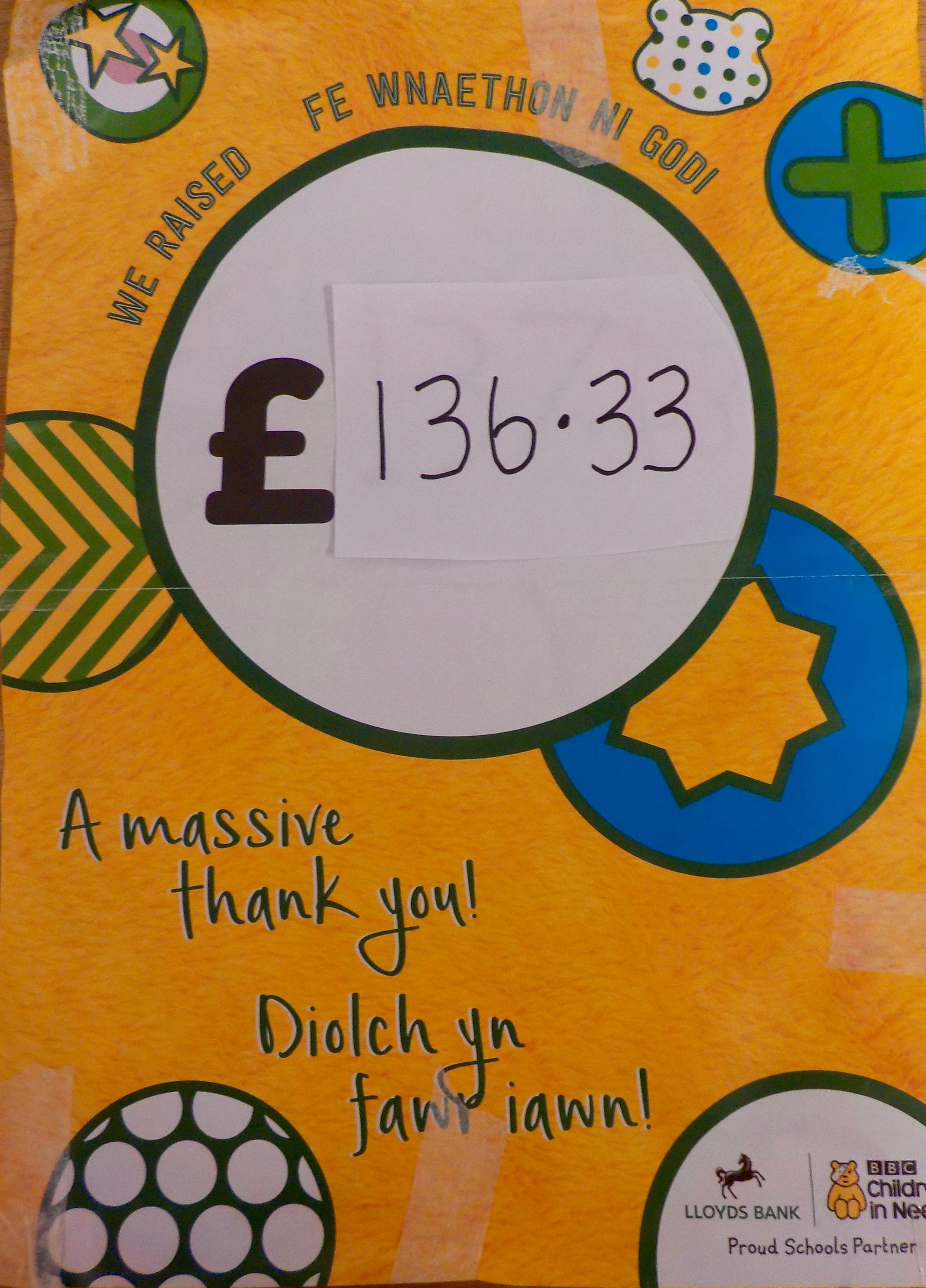 Roedd pawb yn smotiog iawn ar ddiwnod plant mewn angen, a dyma ni'n hel £60